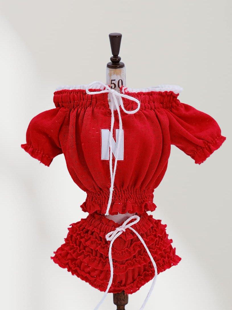 This vibrant red cheerleader outfit is designed for dolls, blending youthful charm with adorable style.