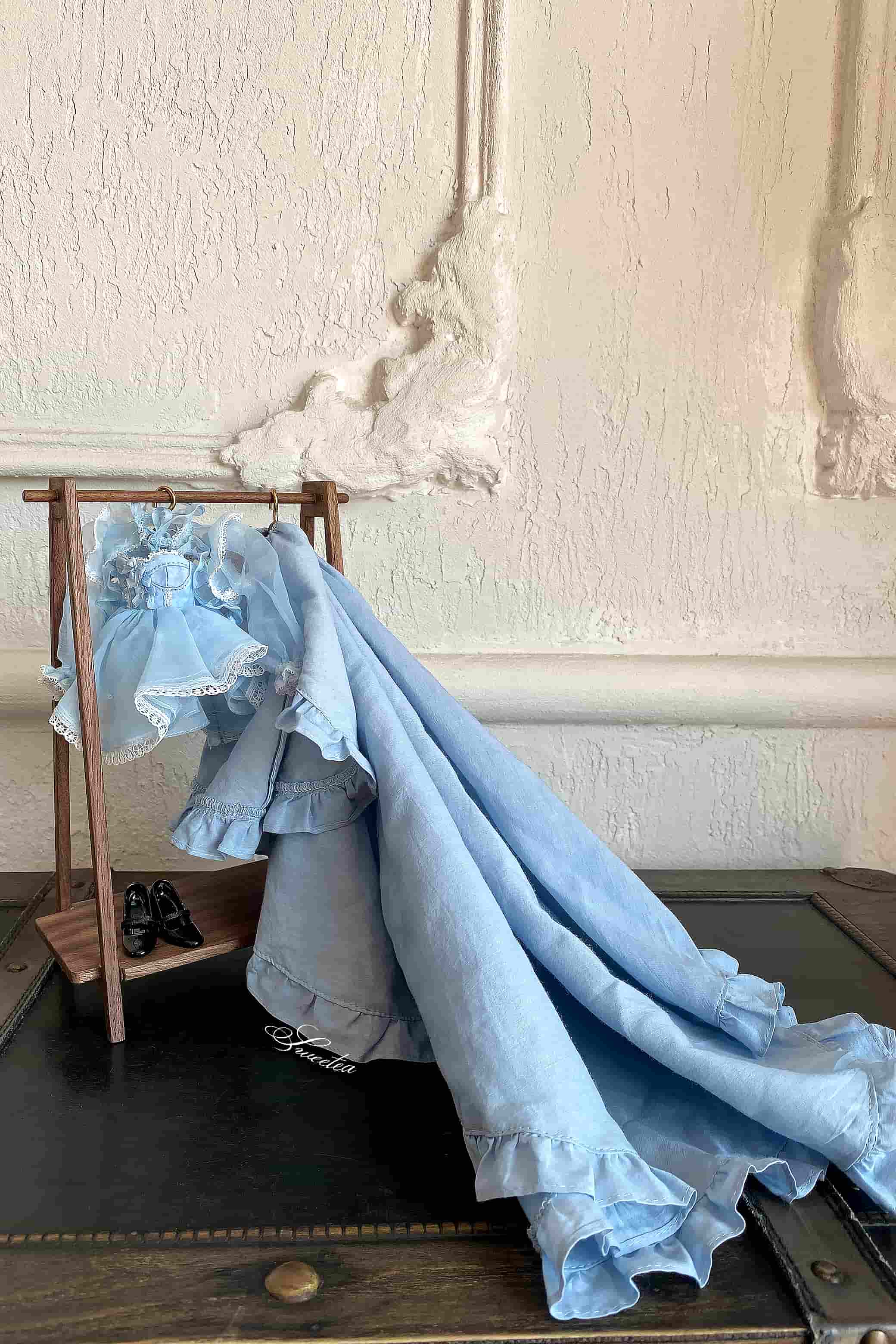 Inspired by Elsa's icy elegance, this dreamy blue gown set features a strapless dress, delicate bolero, grand trailing cape, and lace white stockings.