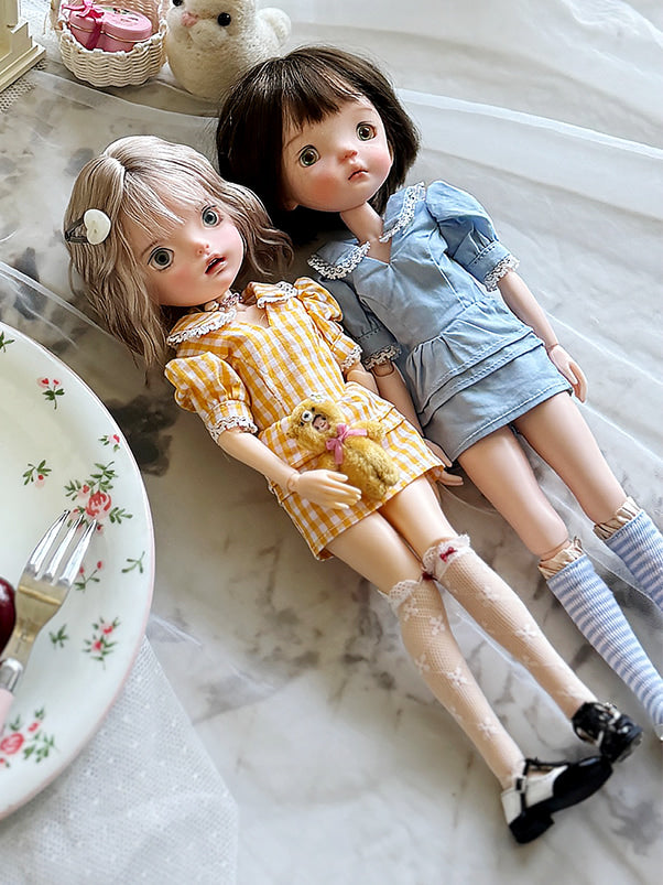 Lemon Cream – Yellow gingham dress with soft lace trim, paired with openwork crochet lace socks