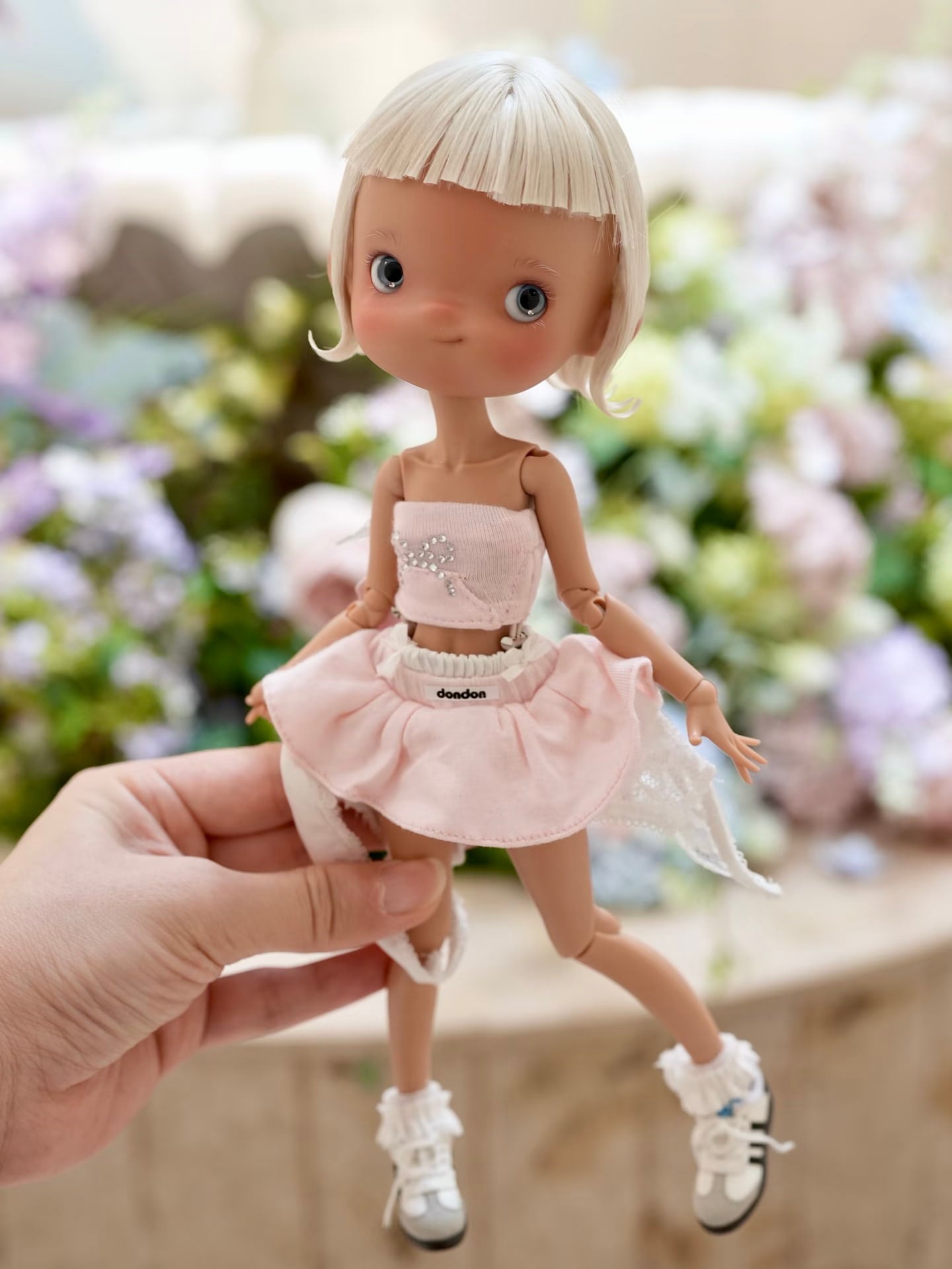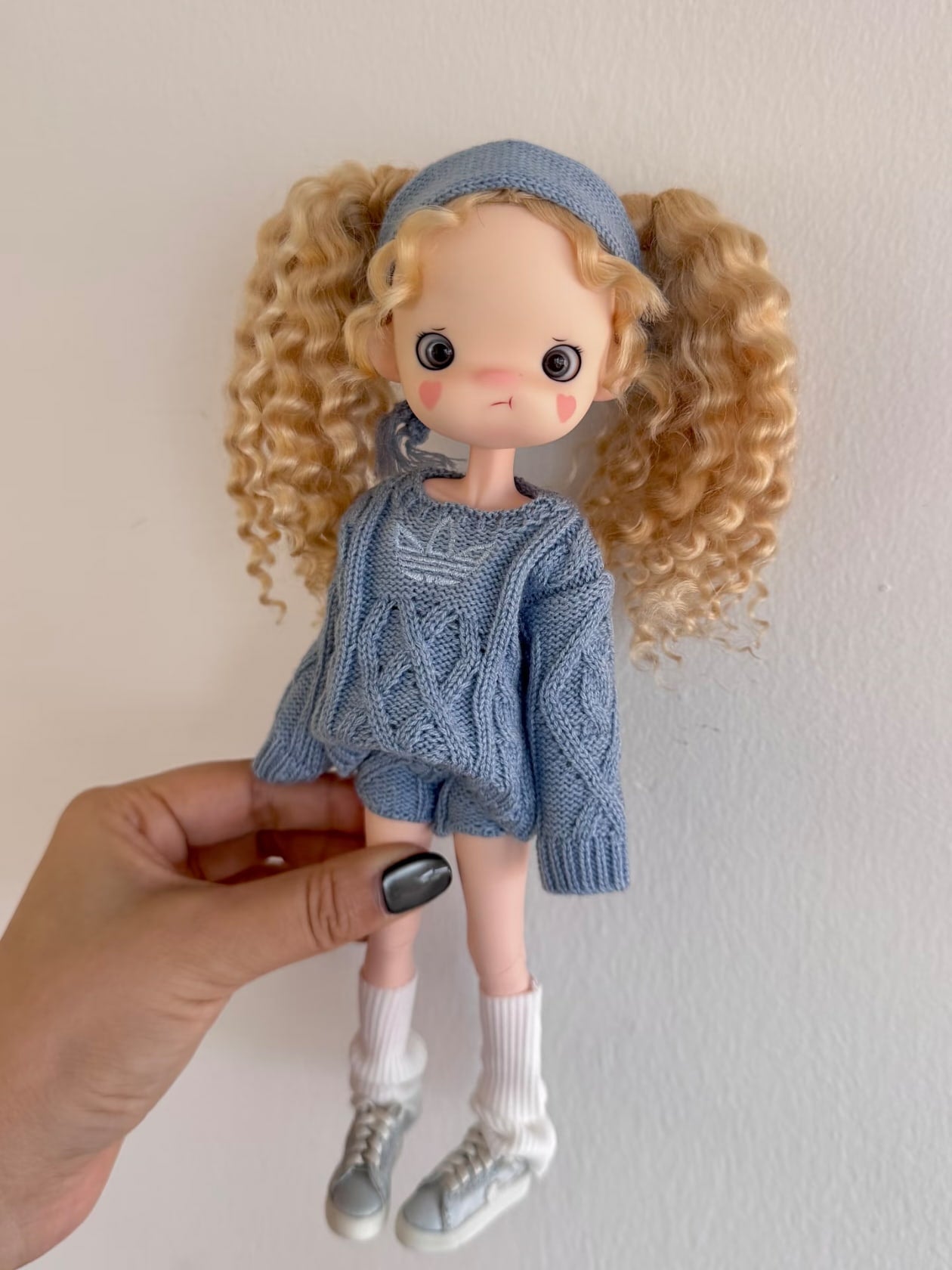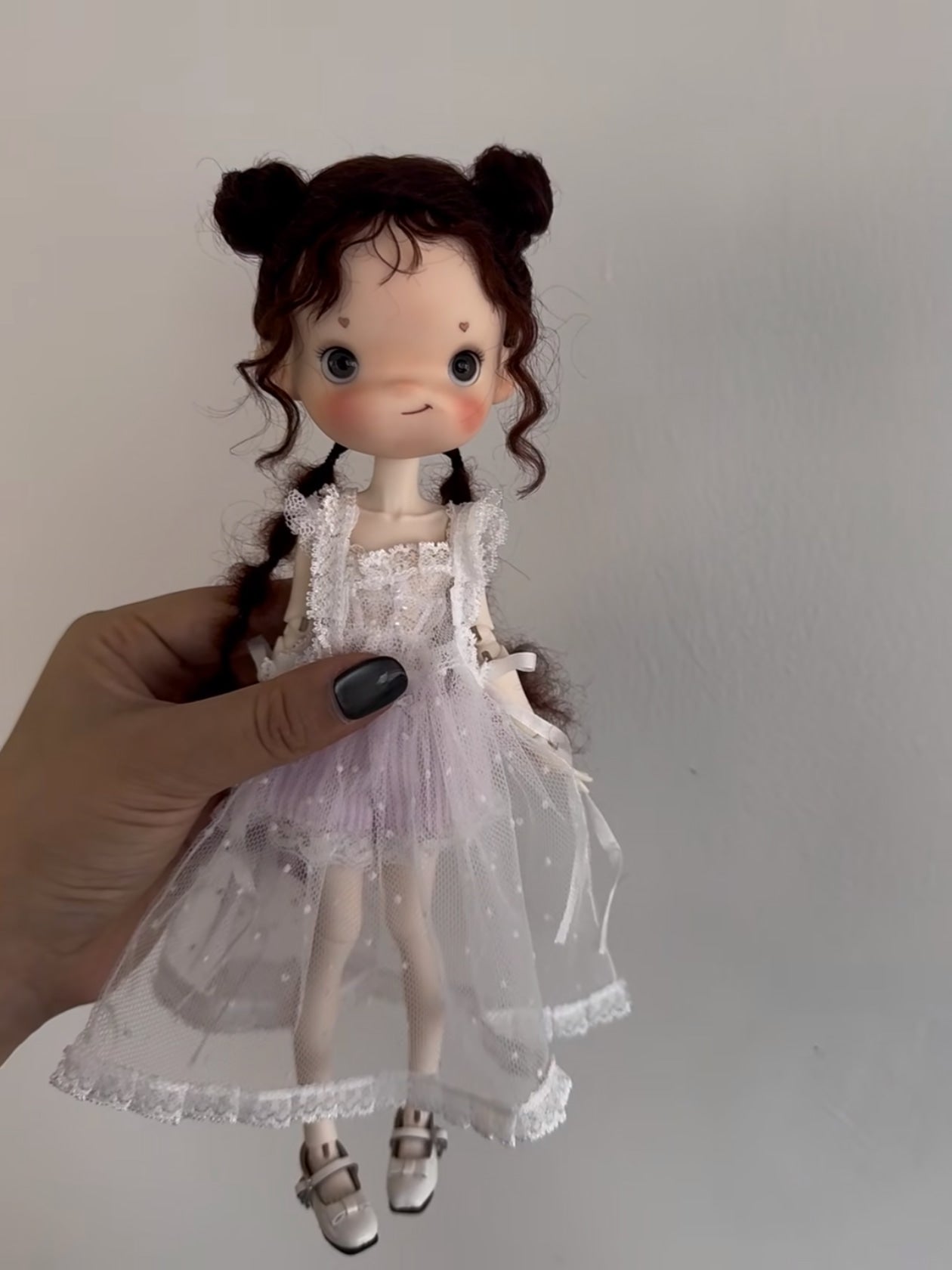 Jenju was born from a very personal story — inspired by a little rescue dog I adopted half a year ago. When I first met her, she was anxious, wounded, and scared. But with time and love, she blossomed into a confident, sassy little soul, brimming with trust and light. That journey from pain to joy, from fear to warmth, was something I wanted to preserve in doll form. Jenju is that memory — my tiny pearl of healing and love.