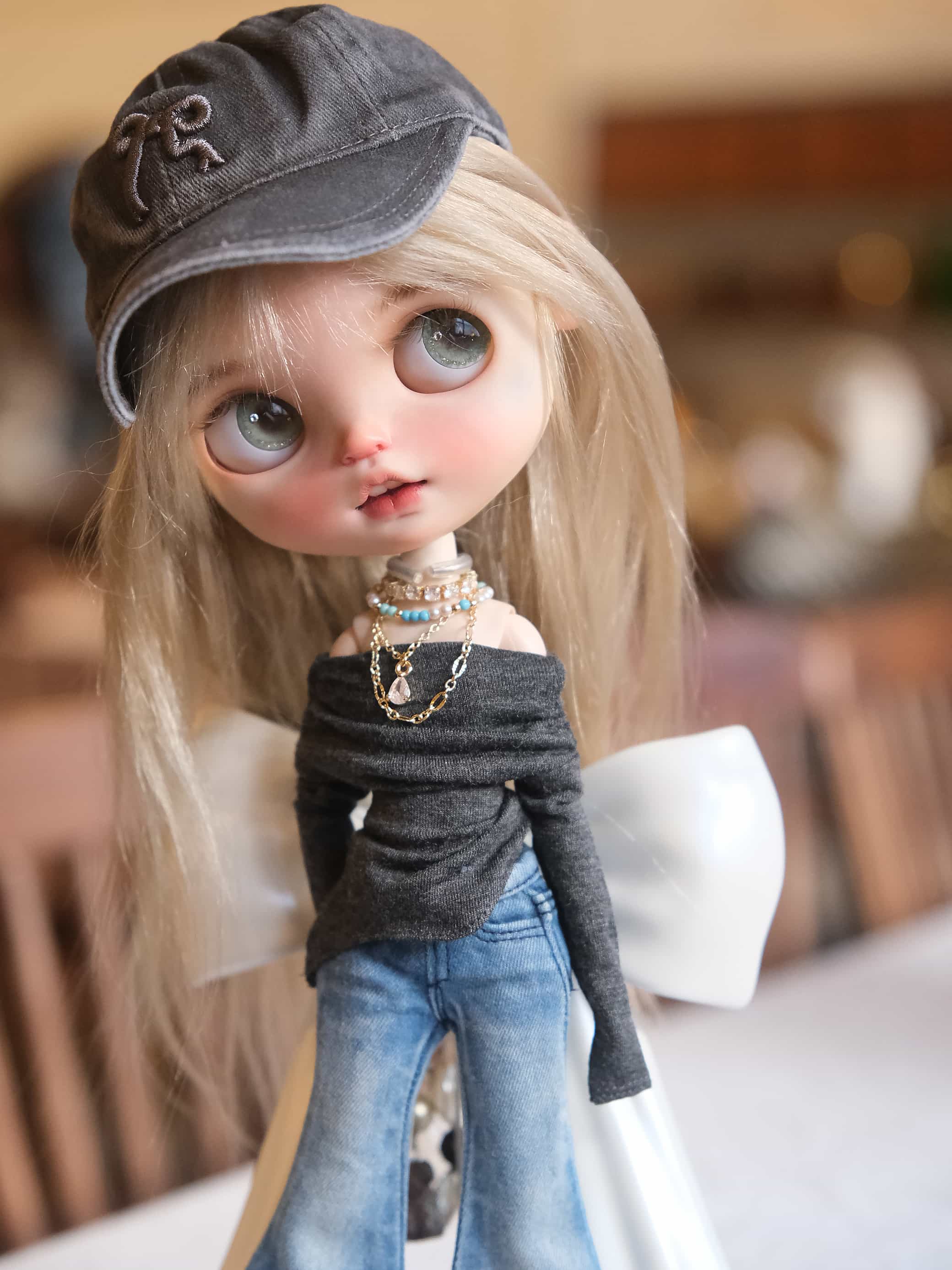 A cozy off-shoulder knit top that instantly gives your doll that effortless café-street vibe.